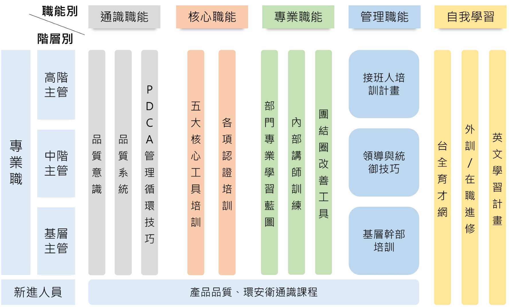 我們建立完善的訓練藍圖,根據不同層級和職位的需求,規劃各階層及職能的訓練課程,提升同仁的專業技能並支持其個人學習和發展。我們重視每一步訓練過程的方向和目標,打造優質人才,確保同仁在管理能力或專業技能上持續成長。